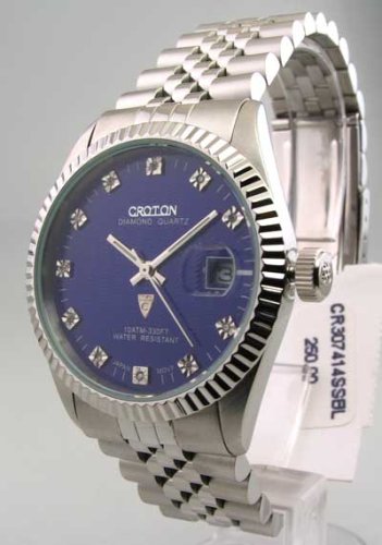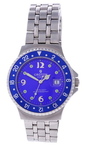 * All Stainless Steel Case & Band * All Stainless Steel Case & Band * Sleek Adjustable Stainless Steel Band * Analog with Silver Luminous Glow in Dark Hands * Royal Blue Face w/ Diamond Markers * Rotating Second Hand * Precision Japan Quartz Movement * Quality Parts * 10 ATM - 100 m - 330 ft - Water Resistant * Domed Scratch Resistant Mineral Crystal * Guaranteed 100% Authentic Croton Watch ****Watch Stats**** [FACE] * Style: Analog * Shape: Round * Size: 1-3/8" * Color: Royal Blue * Hands: Silver * Hour Markers: Silver & Diamonds * Misc: Sweep Second Hand Date at "3" Position [BAND] * Material: Stainless Steel * WristSize: 5-3/4" to 7-3/4" * Width: 3/4" * Color: Silver * Clasp: Fold Over * Misc: Adjustable - 6 - 1/4" Removable Links